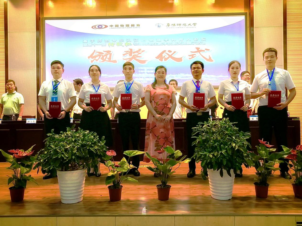本次交流展示活动由中国教育学会物理教学专业委员会支持,《物理教师》编辑部与《中学物理》编辑部主办,阜阳师范大学承办。我校物理与电信学院领导班子高度重视此次比赛,经过层层选拔,派出物理学本科生4名,物理教育研究生2名组成的代表队,由杜杰书记领队参加交流展示活动。与来自北京师范大学、东北师范大学、华中师范大学、华南师范大学、上海师范大学等63所高等师范院校的494名学生在教学设计、说课、授课和创新实验设计与自制教具展示等环节进行比赛和交流。在大赛采取实名制竞赛规则的情况下,力战群雄,勇于挑战,最终卓思轶荣获物理本科组教学技能一等奖,创新物理教具三等奖、李道恒荣获物理本科组教学技能二等奖、向倩荣获物理本科组教学技能二等奖、赵之琳荣获物理本科组教学技能三等奖;夏子聪荣获物理研究生组教学技能一等奖,创新物理教具三等奖、张衎荣获物理研究生组教学技能二等奖。比赛组委会主任,天津师范大学孙佩雄主任对我们学校给予了高度的评价。
