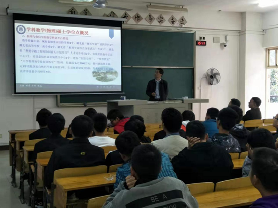 我院副院长徐火希教授介绍了黄冈师范学院学科专业建设、师资队伍建设、学科教学(物理)领域成就、平台建设、导师风采、竞赛获奖情况等,重点介绍了该校研究生招生政策以及近几年硕士研究生招生情况。学院执行院长兰智高教授现场回答了与会学生关心的热点问题并对学生研究生报考进行了指导。