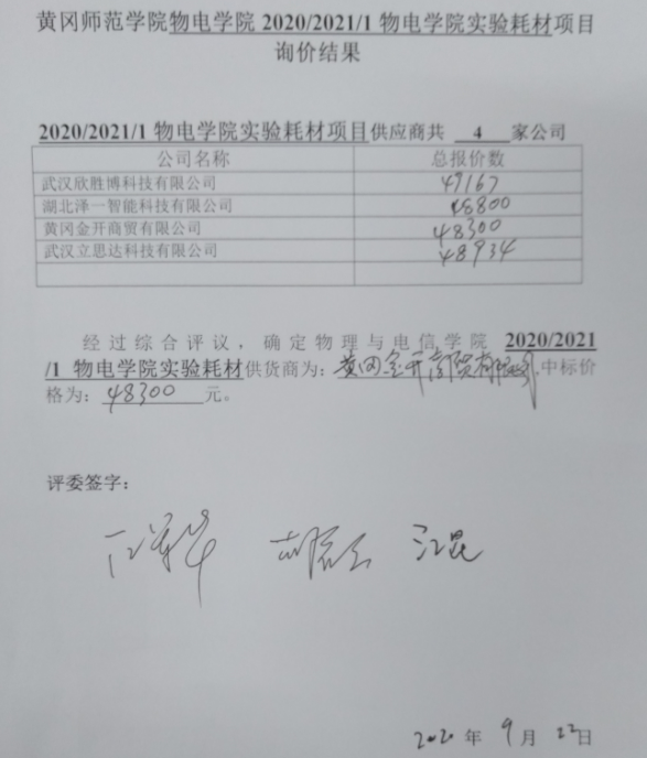 黄冈师范学院物电学院2020年秋季第一次实验耗材的采购招标工作从2020年9月13日启动,公开面向社会招标,并在学院网上公示,截止到9月20日共收到有效标书4份,于9月20日学院组织人员开标,开标结果为:黄冈金开商贸有限公司以人民币48300元的价格中标。在此表示祝贺。