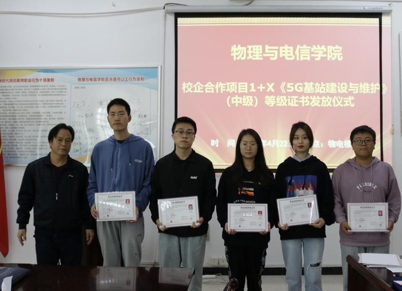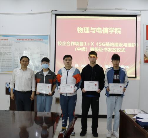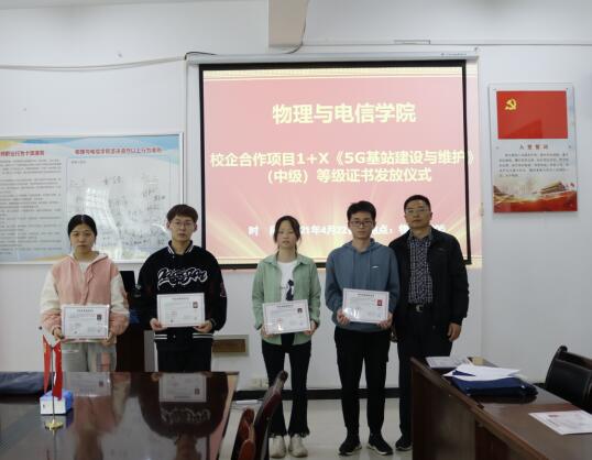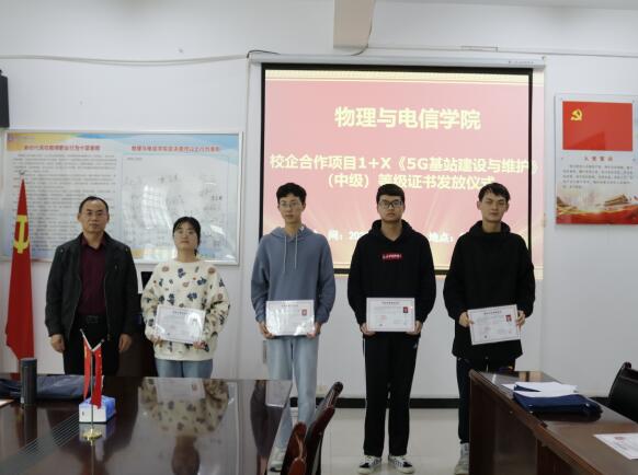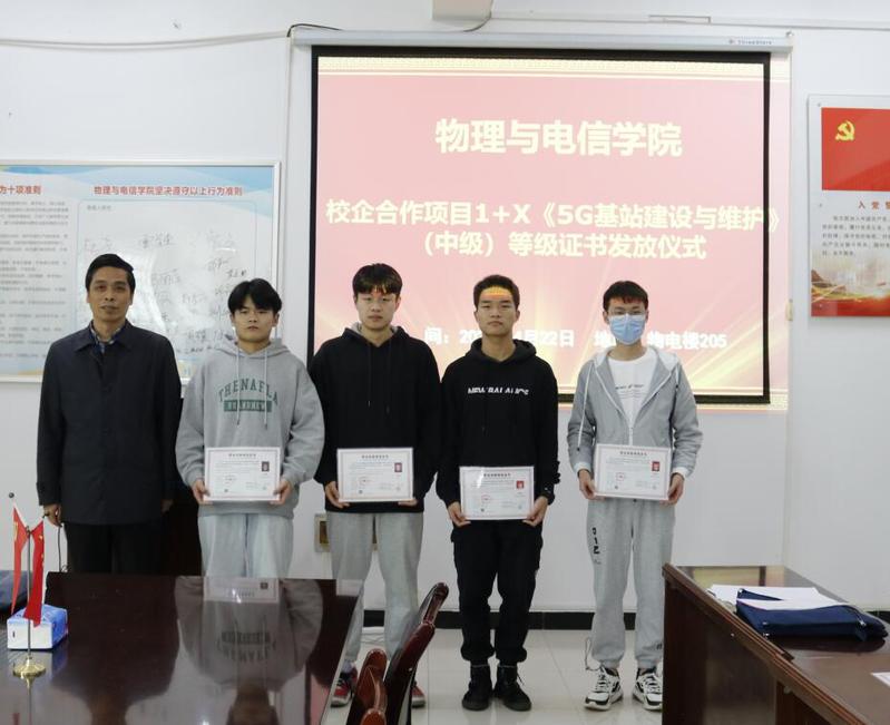2021年4月22日下午,物电学院举行校企合作项目1+X《5G基站建设与维护》职业技能等级证书发放仪式。学院党政领导班子及获得证书的电子信息工程专业202001、02班21名学生参加发放仪式。