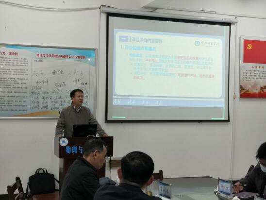 2022年3月17日下午,数学与统计学院廖小勇教授在物电楼205会议室为物理与电信学院全体教职工做了题为《师范专业认证课程目标达成度评价的认识与实践》报告。