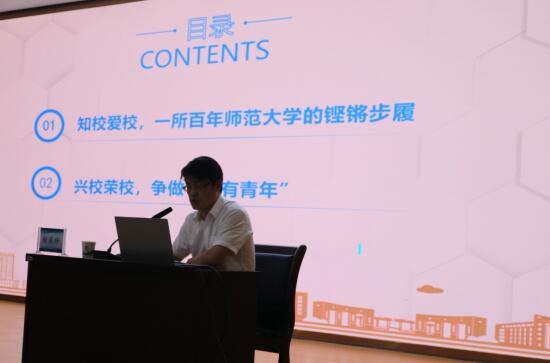 胡校长从发展历程和红色黄师两个方面阐述了黄冈师范学院悠久的办学历史,指出黄师精神文化源于艰苦磨砺的岁月,是黄师人最宝贵的教育遗产。详细介绍了校徽、“厚德、博学、力行、致远”的校训、“尚师表、勇担当、秉诚朴、图自强”的黄师精神、让人热血沸腾的黄冈师范学院校歌、黄师十景,并描述了以进入“全省一流”的行列、达到“全国知名”的高度、建成“高水平师范大学”为目标的远景规划。