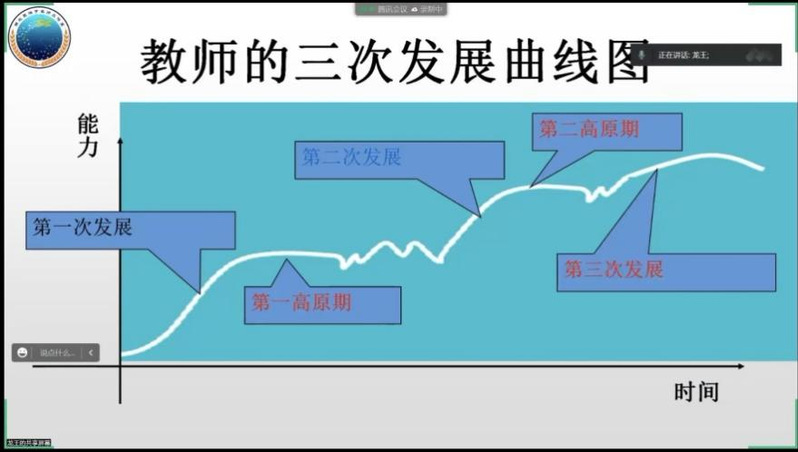 王性宇的报告主题为《培根固本守正创新-物理教师发展之我见》。他指出教师的专业发展月有三方面的要求:一为知识系统,二为教育实践能力和教育科研能力,三为积极情感和高尚人格。他认为教师的成长是一个三次发展的曲线图,部分教师终生处于第一阶段的高原区,即一名合格的教师,更多的老师则停滞在第二阶段的高原区,即一名优秀的教师。而我们的教师应该把能进入第三阶段作为目标。