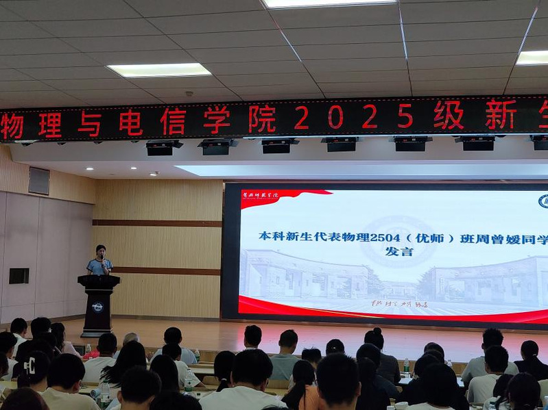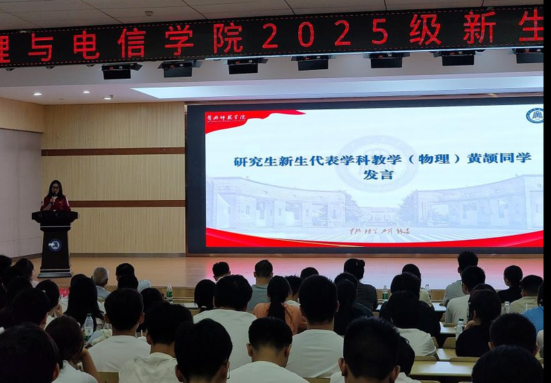 研究生新生代表学科教学(物理)黄颉与本科新生代表物理2504班周曾嫒同学随后登场,他们用真挚的语言表达了成为“黄师物电人”的喜悦与自豪,承诺将以“萌新”的热情拥抱大学生活,以“奋斗者”的姿态攻克学习难关,积极参与学科竞赛与实践活动,努力成长为有理想、有本领、有担当的物电学子。