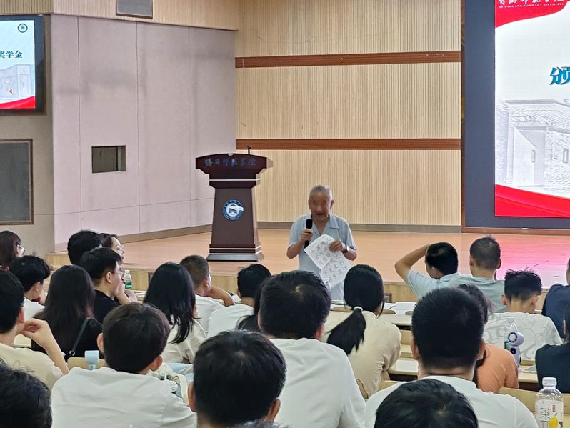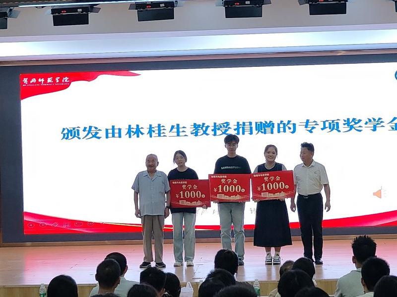 典礼的重要环节之一,是为学院优秀学子颁发由90岁高龄的退休教师林桂生教授捐赠的专项奖学金。虽年过九旬,林教授依旧精神矍铄、身体硬朗,不仅特意为此次典礼准备了多份亲笔书写的寄语,字里行间满含对后辈的期许与对学院的牵挂;学院党委书记卢年桥与林教授共同为获奖学生颁奖,将这份承载着治学精神与温暖关怀的荣誉送到学生手中。两位师长的共同见证与勉励,令现场掌声经久不息。