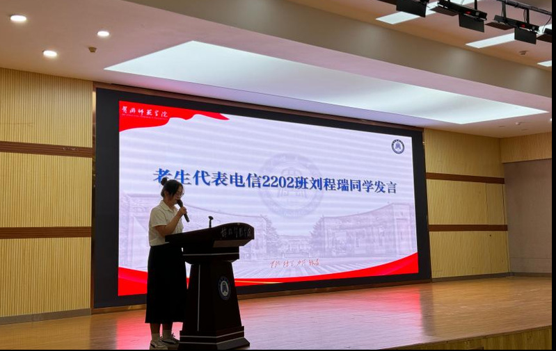 大学生活是一幅徐徐展开的画卷,学长学姐的经验是最好的参照,老生代表电信2202班代表刘程瑞紧接着发言,她以黄师校训“厚德、博学、力行、致远”为切入点,结合自己在学习、社团活动和志愿服务等方面的亲身经历,分享了成长中的收获与感悟。她鼓励新生们既要脚踏实地打牢专业基础,也要胸怀远志、勇于实践,在黄师的舞台上书写属于自己的精彩篇章。