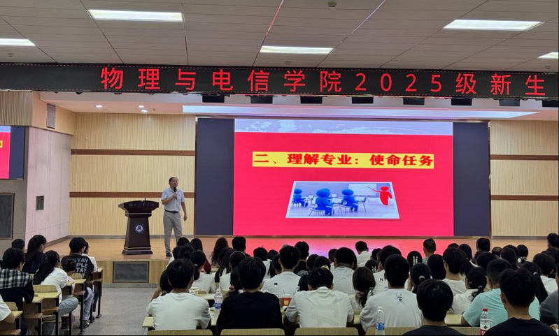 2025年9月16日上午,星空官方网页版2025级新生开学典礼在北区报告厅隆重举行。304名本研新生正式成为光荣的黄师物电人。黄冈师范学院全体领导班子成员、退休老教授林桂生教授、学院教师代表、全体辅导员、新生班主任老师,以及2025级全体新生共同出席。典礼由学院党委副书记王世伟主持。