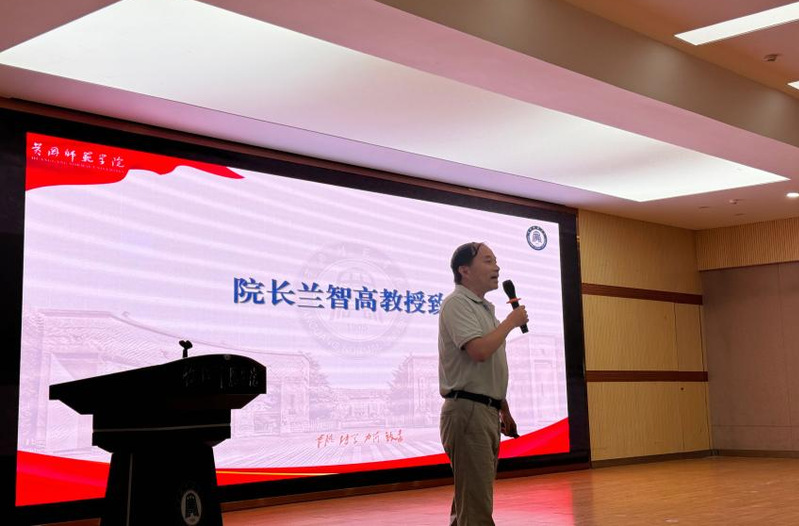 国歌毕,学院院长兰智高教授发表题为《追求卓越,做最好的自己——我的大学我做主》的讲话。兰院长在讲话中,回顾了黄冈师范学院百余年的办学历史与辉煌成就,并向与会人员介绍了学院在物理学、电子信息工程、光电信息科学与工程等专业的建设成果与师资力量,勉励新生深刻理解专业内涵、明确发展方向。兰院长强调大学生自律的重要性,提醒同学们合理安排时间、理性使用手机、树立正确消费观,做有目标、有规划、有担当的新时代大学生。他鼓励大家结合社会需求与个人特长,制定科学的大学四年规划,积极参与学科竞赛、科研创新与社会实践,不断提升专业能力与综合素质,以扎实的专业知识、创新的思维能力,在物电领域探索未知、追逐梦想。