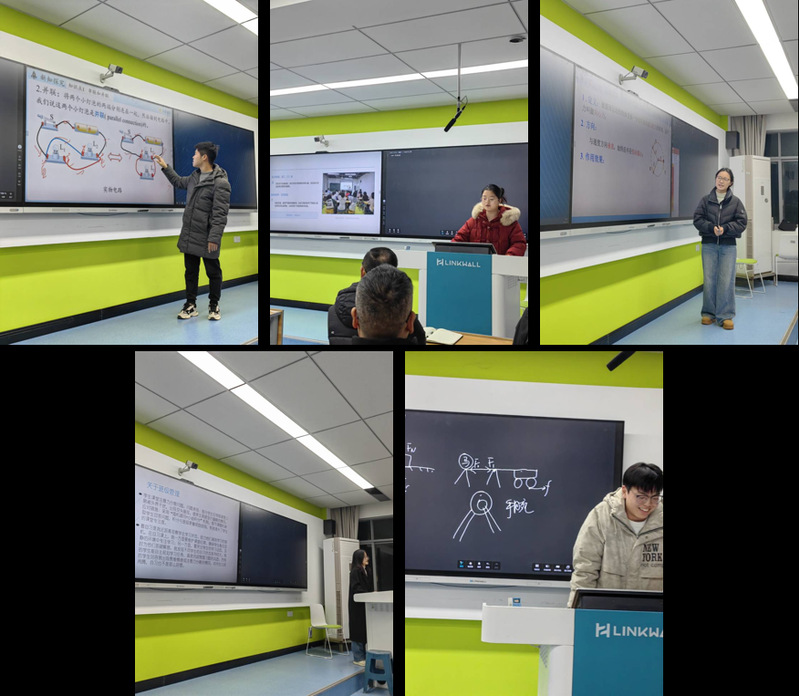 本次实习分享会邀请了物理2201班汪燚桦、物理2202班袁智俐、物理2203班刘畅、物理2203班王雨晓、物理2204班钟一帆等五名同学进行实习分享。会上,他们从实习安排、过程管理、实习成果等方面,详细介绍了各自教育实习的整体情况与心得体会;同时,五名同学还进行了15分钟的教学片段汇报,内容分别围绕《串联电路和并联电路》《电能 电功》《实验:验证动量守恒定律》《向心力》《牛顿第三定律》展开。实习分享与教学汇报充分展现了教育实习的实际成效,以及同学们扎实的专业素养与教学能力。